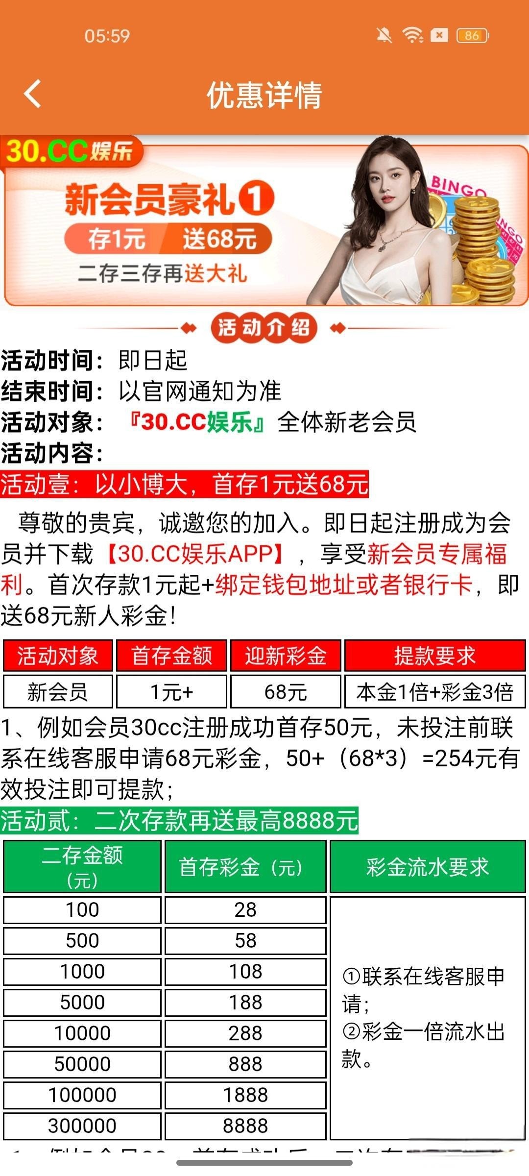 新人活动冲一块送68,不限制游戏可以打真人视讯,下载app找客服申请,平台最低充值30,后期开通快充通道,首次存款送88彩金。