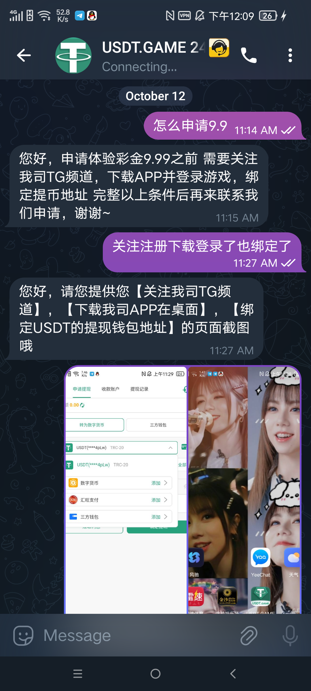 新用户注册下载APP,绑定常用的USDT,狗庄会看你流水决定给不给你送,然后联系活动上面的TG专员/客服申请9.9U≈约70RMB,出款自测!
