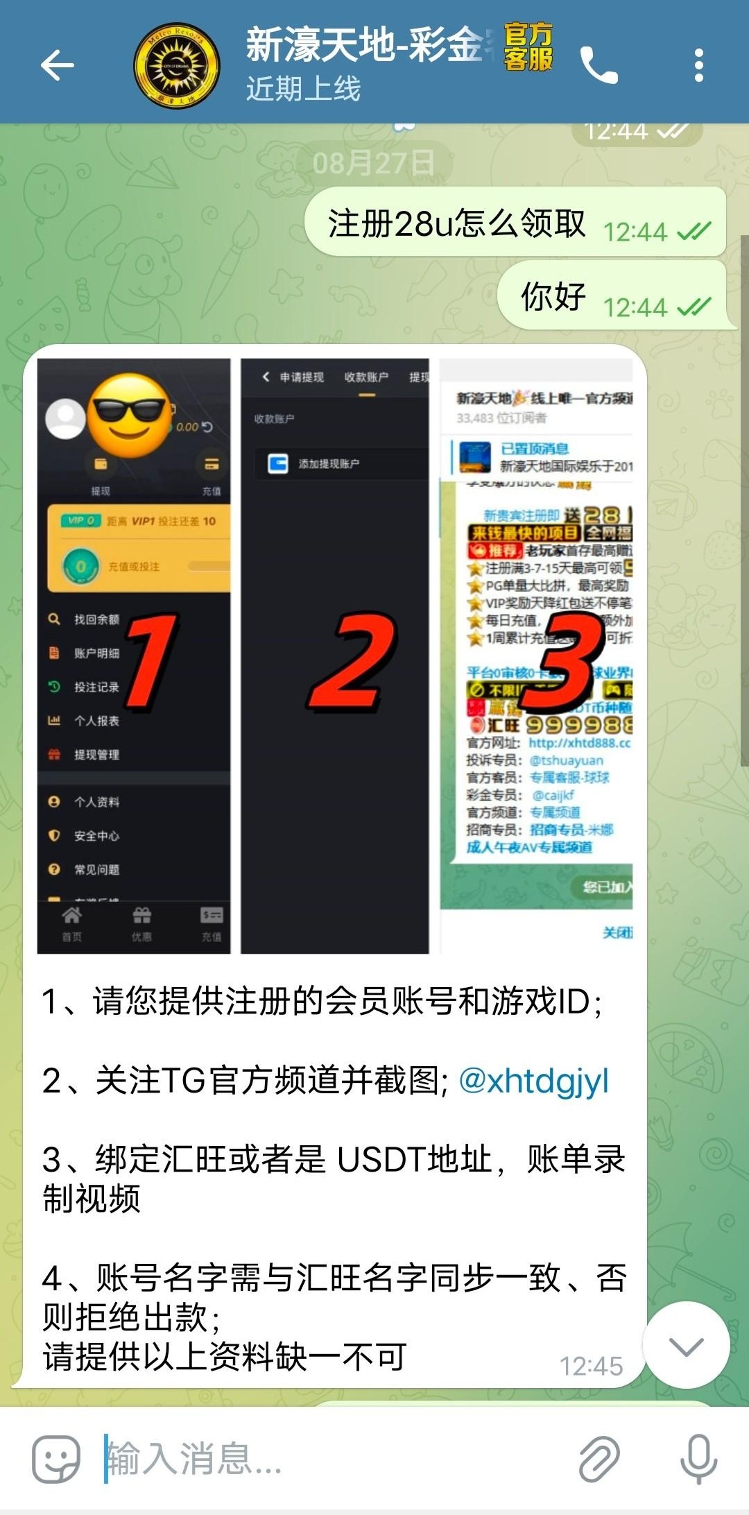 需录制汇旺/usdt交易流水,限制电子,5倍流水,最低最高100u提现,其他自测。